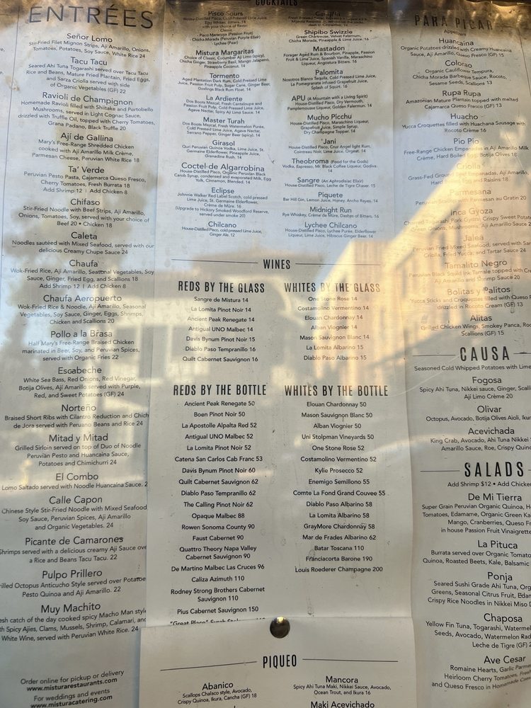 Mistura Restaurant, a Latin American-Peruvian-seafood fusion eatery located in San Luis Obispo, offers a diverse menu catering to various dietary needs. With vegan and vegetarian options, wheelchair accessibility, and even cryptocurrency payment, Mistura ensures inclusivity and convenience for all its guests. The menu features enticing dishes like Chicharron Lunch, Lomo al Jugo Lunch, and Alpaca Burger. Their Piqueos section offers unique bites such as Bolitas y Palitos and Alpaca Carpaccio, showcasing the restaurant's commitment to authentic Peruvian flavors. Sopas and Ensaladas like Aguadito de Pollo and De Mi Tierra highlight Mistura's dedication to using fresh, organic ingredients. With a full bar, happy hour specials, and outdoor seating, Mistura provides a vibrant dining experience for all. Visit Mistura to indulge in a culinary journey through the vibrant flavors of Latin America.